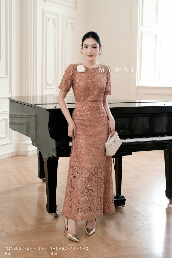 Đầm ren nâu cam đất dáng dài mang đến sự sang trọng tinh tế với từng họa tiết hoa văn uyển chuyển. Điểm nhấn hoa nổi ở vai càng làm bật lên vẻ nữ tính, thanh cao, thích hợp cho những buổi tiệc trang nhã hoặc các dịp đặc biệt, nơi quý cô muốn khẳng định phong cách riêng.