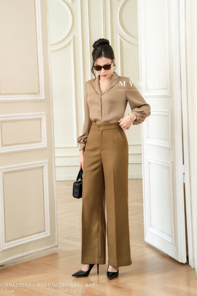 Dáng áo cách điệu và quần âu tone nâu đất sáng. Đơn giản nhưng thanh lịch, mang đến diện mạo gọn gàng và cuốn hút cho những buổi dạo phố hoặc hẹn hò nhẹ nhàng.