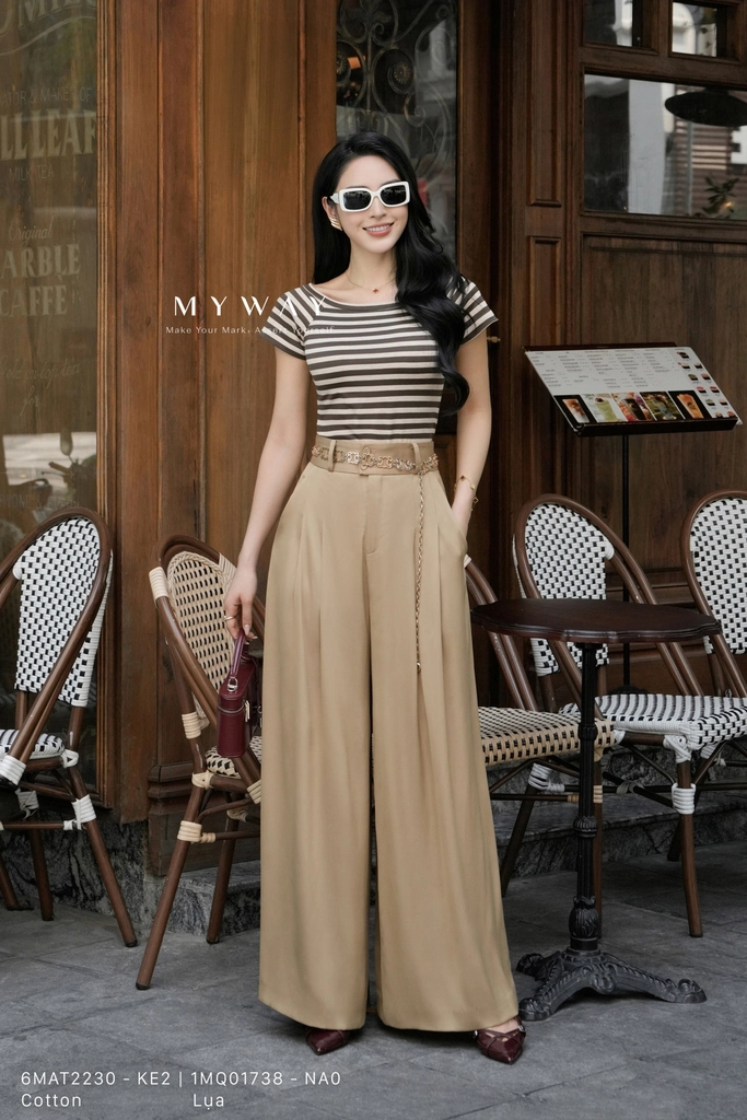 Năng động nhưng vẫn thanh lịch với áo thun kẻ ngang cổ thuyền phối quần ống rộng chất liệu lụa mềm rủ. Chiếc thắt lưng xích mảnh tinh tế là điểm nhấn, giúp tổng thể thêm thời trang và đầy sức sống.