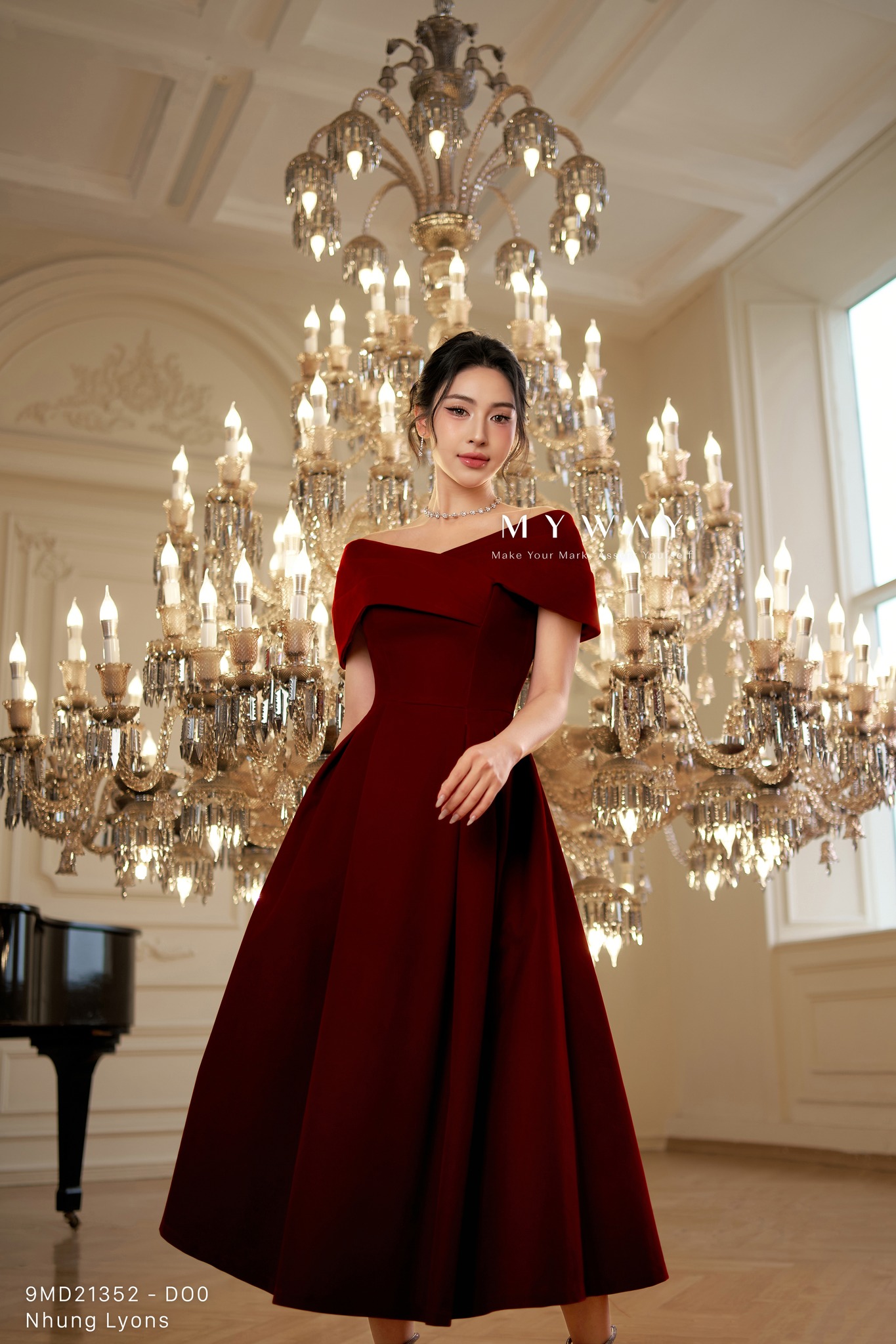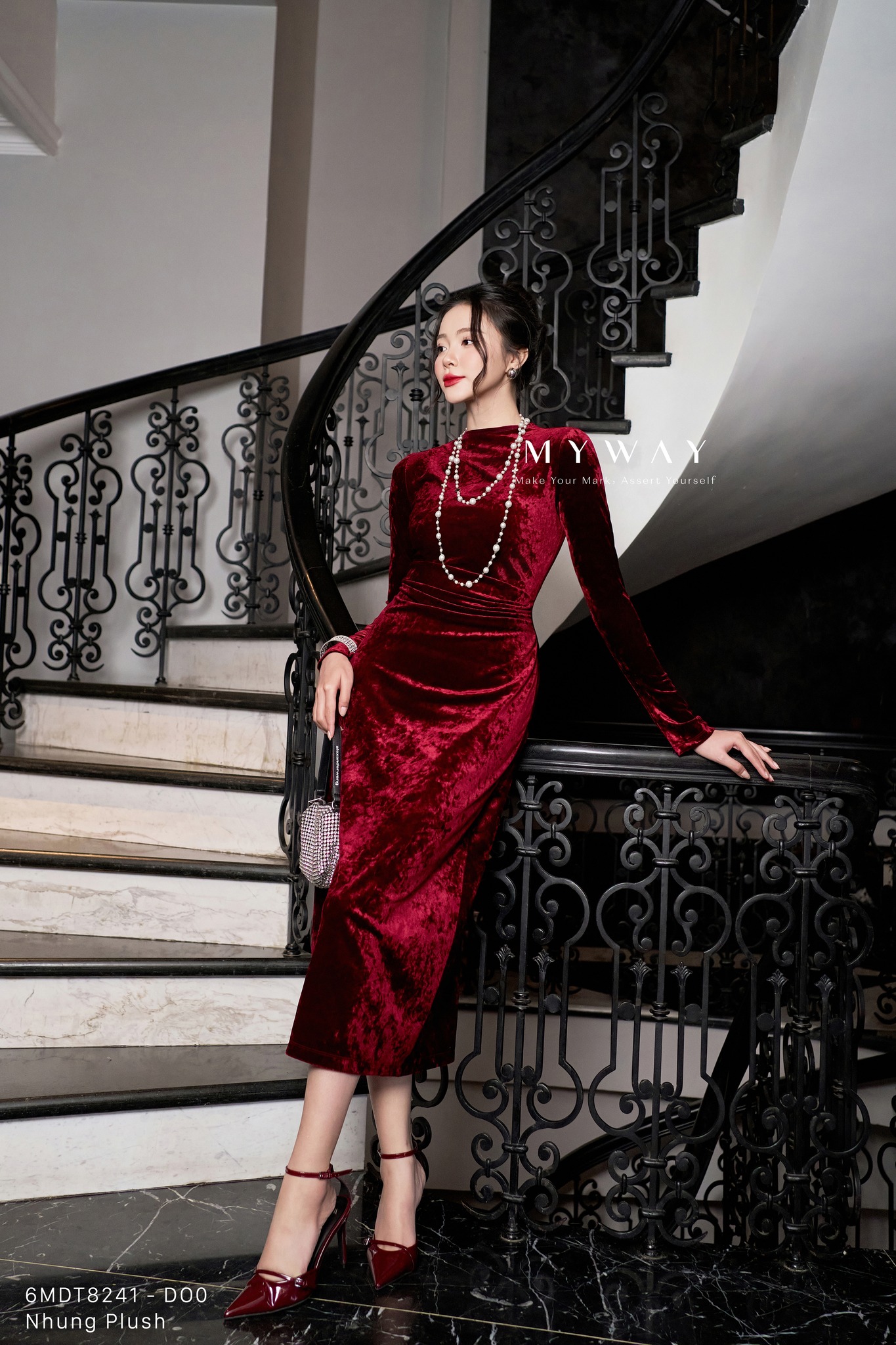 Nhung đỏ trong dáng đầm ôm gợi cảm như được sinh ra để dành cho những bữa tiệc mùa đông. Bề mặt nhung mềm, phản sáng tự nhiên, tạo chiều sâu và độ sang hiếm có. Mỗi bước đi đều như một điệu nhạc – vừa ấm áp, vừa quyến rũ, vừa khiến người đối diện khó thể rời mắt.