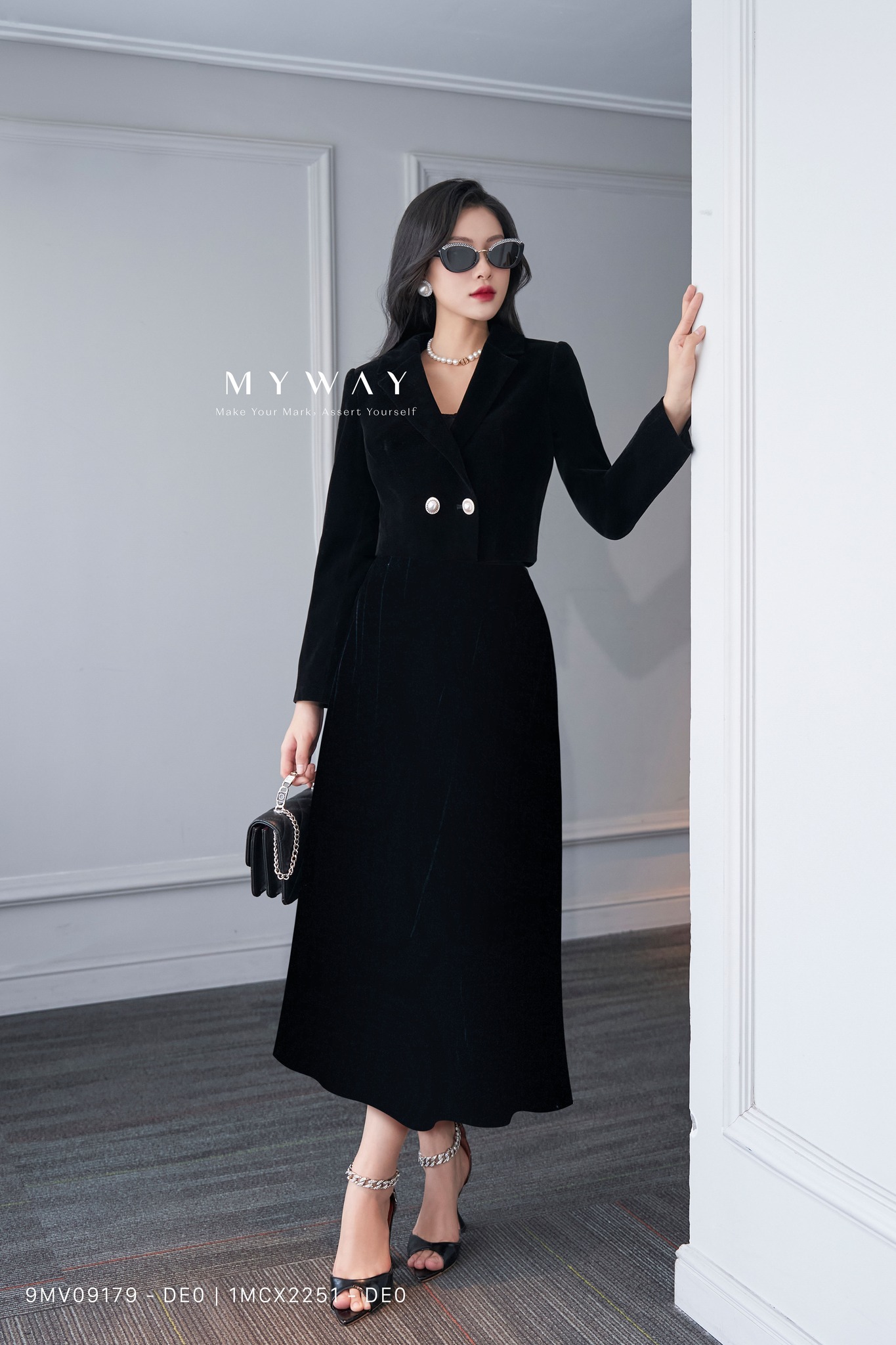 Tông đen tuyền trên nền nhung Plush được xử lý hoàn hảo để giữ độ đứng phom mà vẫn mềm mại khi di chuyển. Mỗi chi tiết, từ khuy ánh bạc đến đường cắt tinh giản, đều tôn lên vẻ đẹp bí ẩn, kiêu hãnh và tự tin – hình ảnh của người phụ nữ My Way: độc lập, sang trọng và luôn làm chủ ánh nhìn.