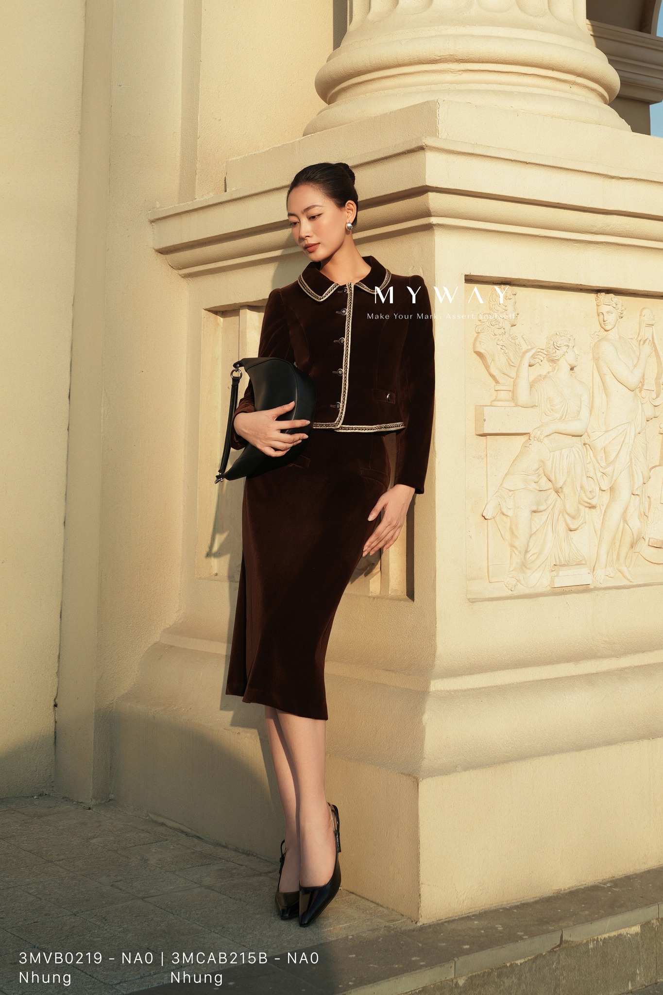 Không chỉ dừng lại ở chất liệu, phom dáng chuẩn mực – từ đầm ôm thanh lịch, vest nhung quyền lực cho đến áo cổ V mềm mại – đều được My Way chăm chút tỉ mỉ, thể hiện trọn vẹn tinh thần “sang trọng không cần phô trương”.